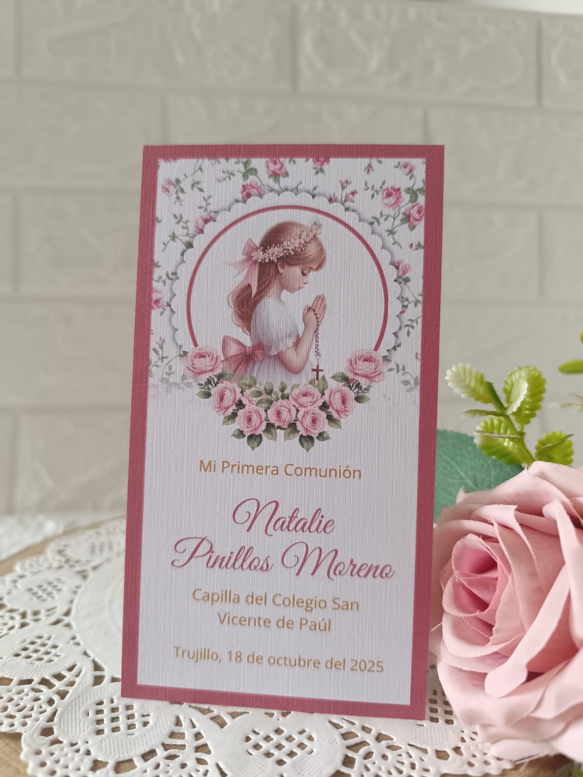 ESTAMPITA PRIMERA COMUNIÓN NIÑA. CON UN FONDO DE FLORES Y MEDIA CORONA DE FLORES.