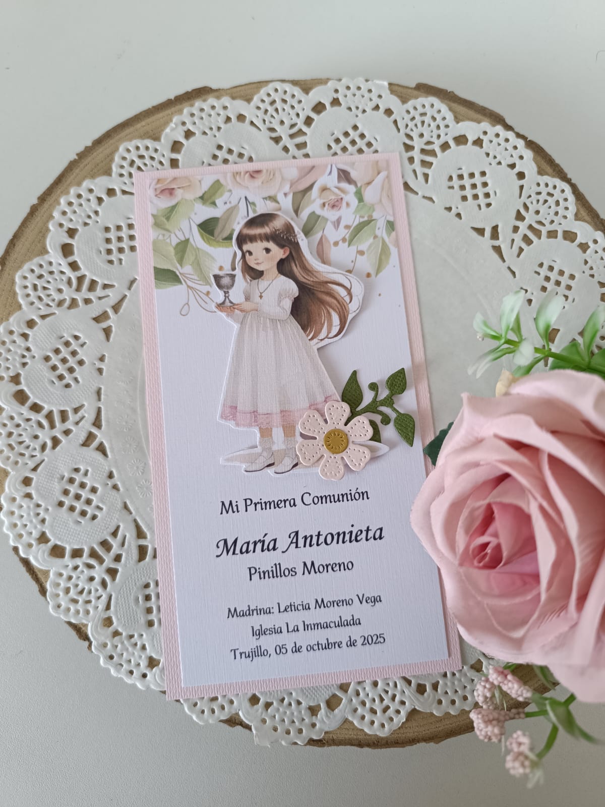 ESTAMPITA PRIMERA COMUNIÓN NIÑA CON FONDO ROSADO Y BLANCO, CON IMPRESIÓN DE HOJAS Y FLORES EN LA CABECERA. EN RELIEVE UNA LINDA NIÑA CON UNA FLOR Y HOJAS VERDES.
