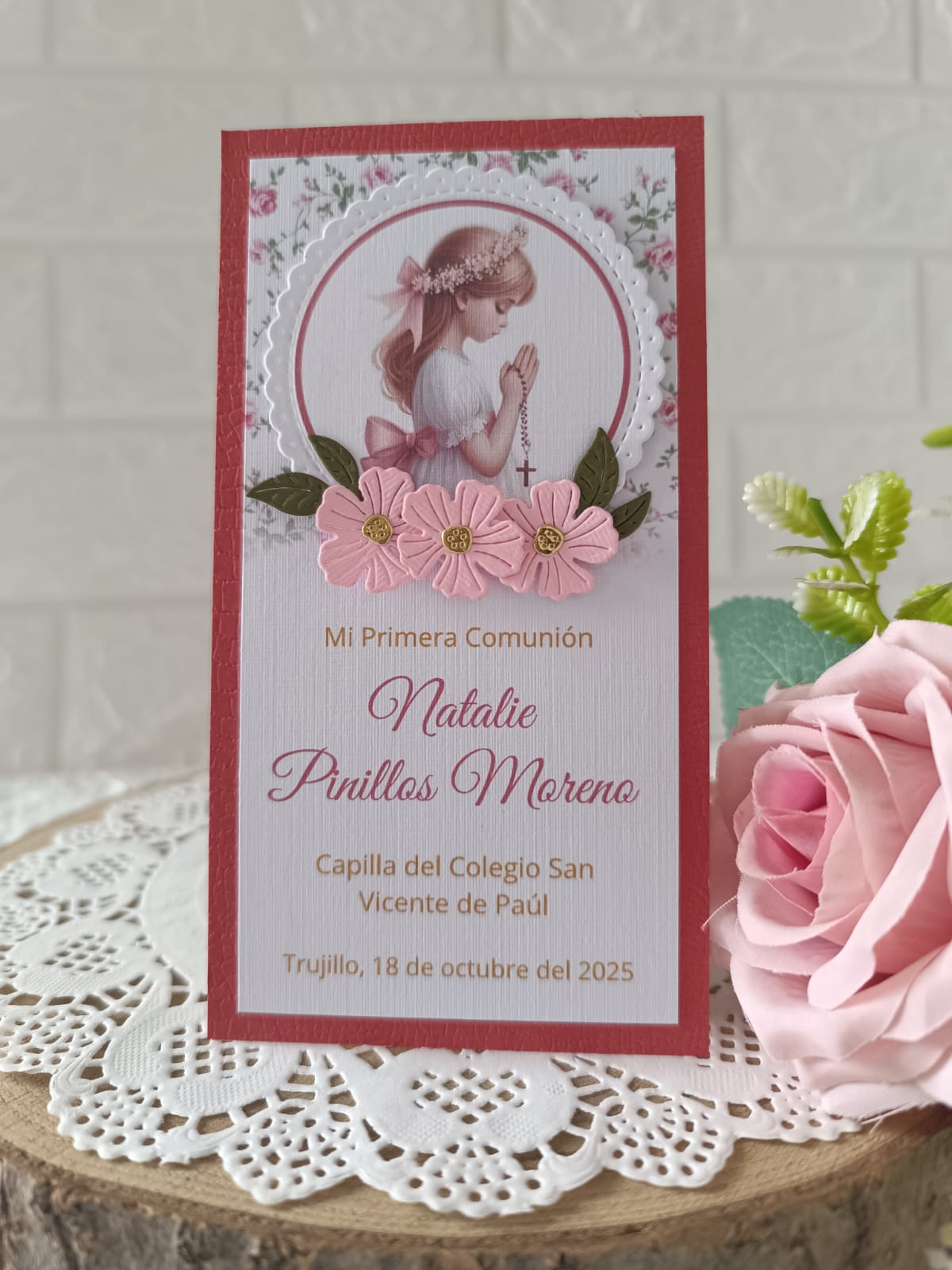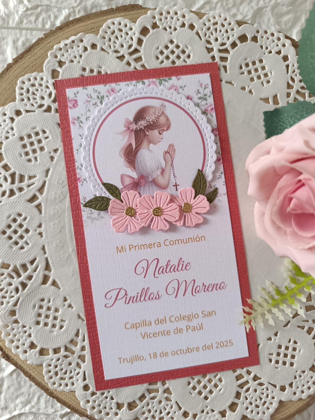 ESTAMPITA PRIMERA COMUNIÓN NIÑA, EN UN FONDO PALO ROSA CON IMPRESIÓN DE ROSAS PEQUEÑAS, UN MARCO CIRCULAR SCALLOP EN RELIEVE JUNTO CON UNAS LINDAS FLORES COLOR ROSA Y HOJITAS VERDES.