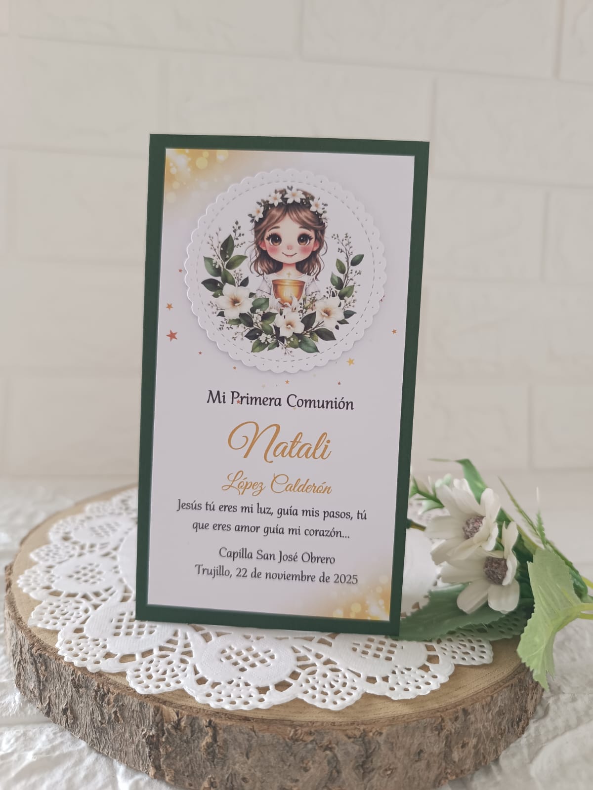 ESTAMPITA PRIMERA COMUNIÓN NIÑA, CON FONDO EN DIFUMINADOS DORADOS Y ESTRELLITAS, EN RELIEVE UN MARCO SCALLOP CON LA IMPRESIÓN DE UNA LINDA NIÑA RODEADA DE UN RAMO DE FLORE BLANCAS.