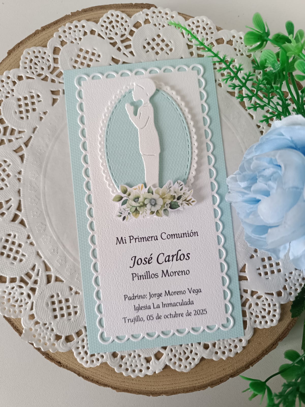 ESTAMPITA PRIMERA COMUNIÓN NIÑO, CON FONDO CELESTE Y BLANCO. EN ALTO RELIEVE DOS MARCOS OVALADOS Y SOBRE ELLOS LA FIGURA EN BLANCO DE UN NIÑO. EN LA PARTE INFERIOR DEL NIÑO UN RAMO DE FLORES.